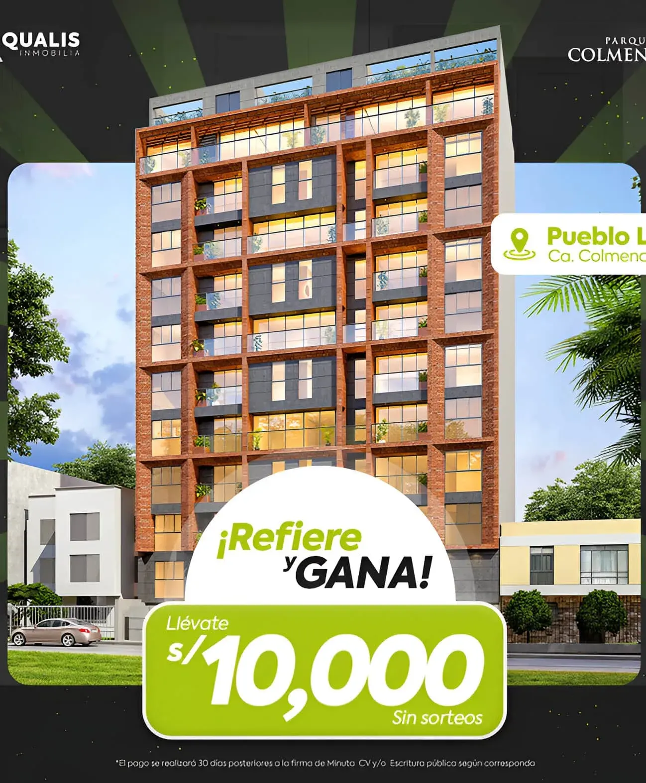 El Bono de referidos aplica para clientes cuyos familiares o amigos adquieran uno o más departamentos. No incluye estacionamientos ni depósitos. El Bono de referidos será de S/. 1,500.00, siempre que el cliente firme la escritura pública y el banco desembolse el crédito hipotecario o pague el total al contado. El plazo para recoger el premio es de 30 dÃas calendarios a partir de la firma de la escritura pública y/o el desembolso del crédito hipotecario.